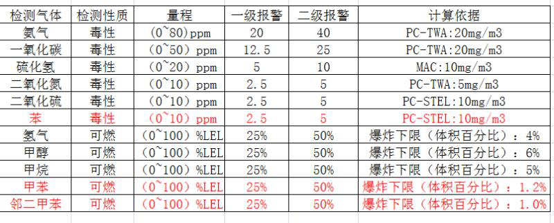 3. 監(jiān)測(cè)因子:氨氣,一氧化碳,硫化氫,二氧化氮,二氧化硫,苯,氫氣,甲醇,甲烷,甲苯,鄰二甲苯;